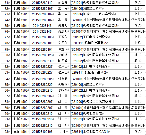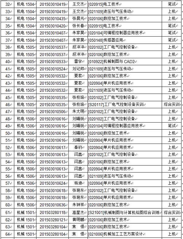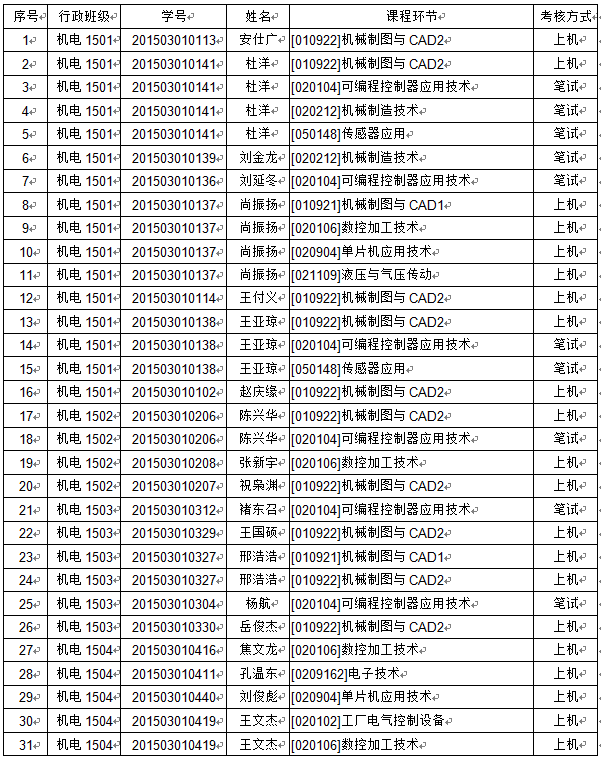 我院定于2017年11月7日进行15级学生顶岗前补考,补考学生名单如下: