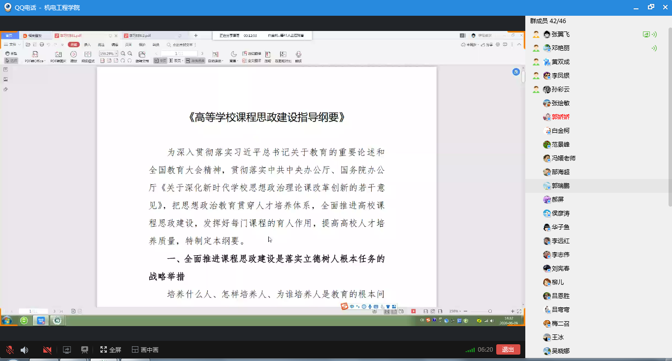 首先,办公室主任张翼飞带领全体教师一起学习了《高校课程思政建设指导纲要》,该纲要从九个方面讲述了高校课程思政建设的指导意见,强调应把思想政治教育贯穿人才培养体系,全面推进高校课程思政建设,发挥好每门课程的育人作用,提高高校人才培养质量。
