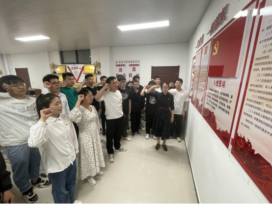 总支书记张亮、支部书记耿丽敏同志为转正党员佩戴党员党徽,并带领全体党员进行入党宣誓。