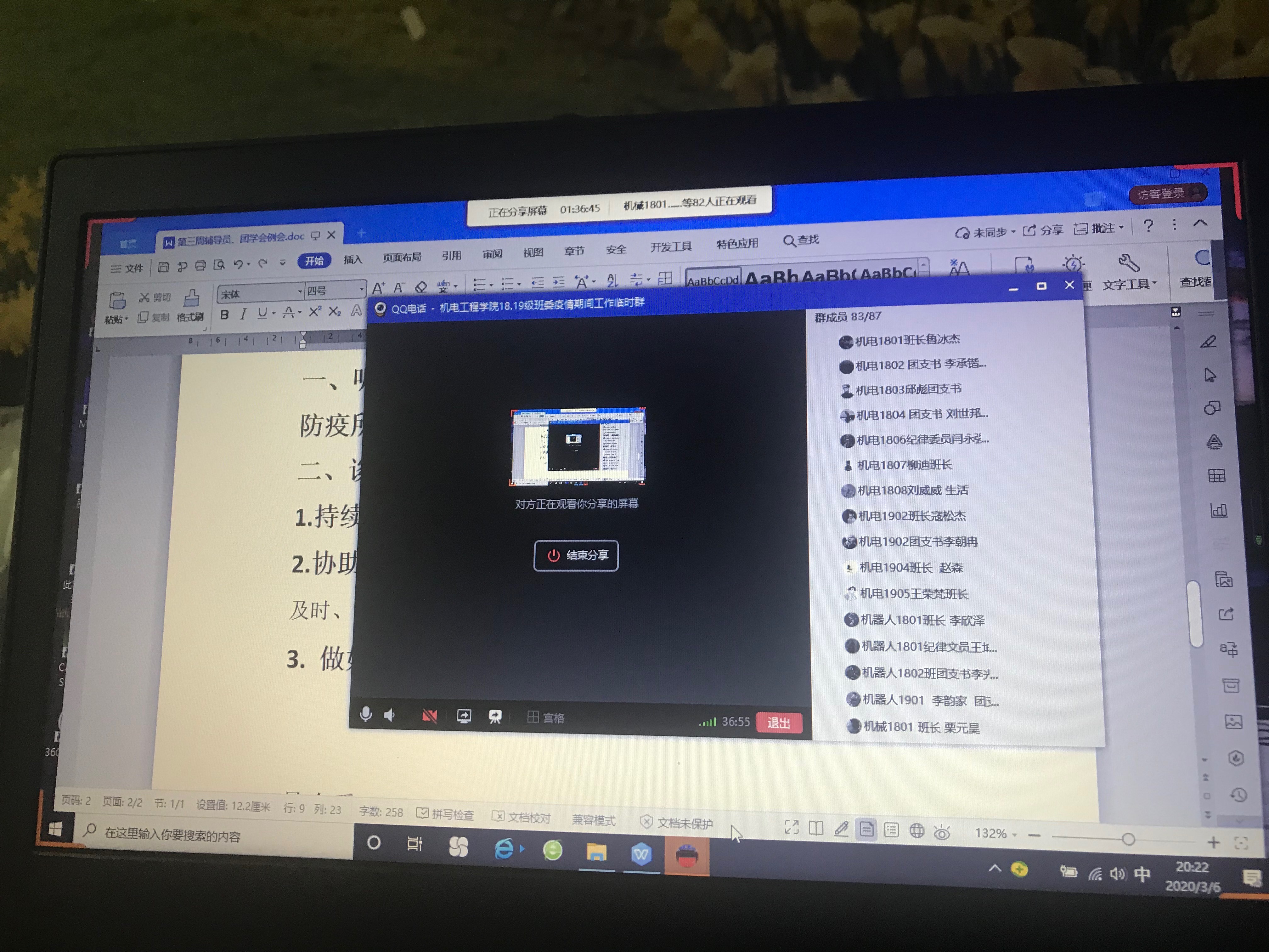 2020年3月6日下午6点,leyu乐鱼在线登录入口通过qq分享屏幕如期召开了第三周辅导员例会,全体辅导员参加,例会由学院党总支副书记邓艳丽主持。