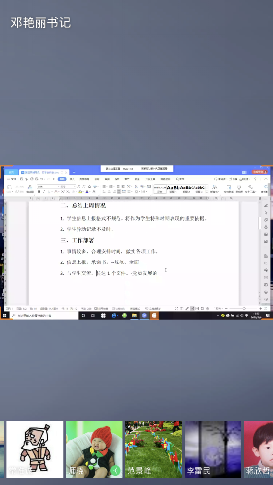 第一环节:邓艳丽书记一一听取了所有干部们针对疫情防护、网络课程及个人遇到的问题三方面的汇报,对于同学们提出的问题,邓书记依次为同学们进行了解答。