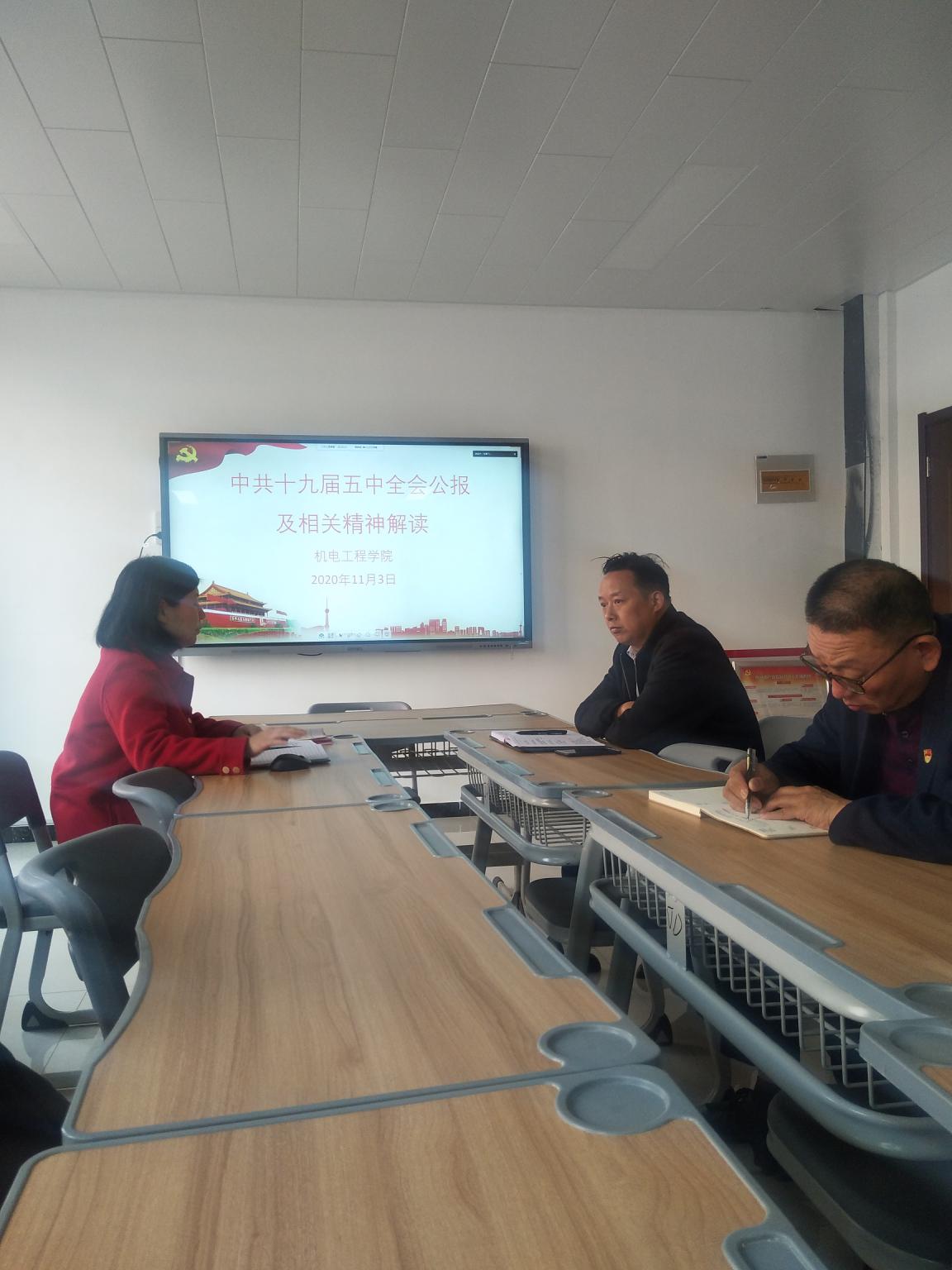 首先,邓艳丽书记带领大家共同学习了中共十九届五中全会公报及相关精神解读。通过学习,大家对十九届五中全会通过的《中共中央关于制定国民经济和社会发展第十四个五年规划和二〇三五年远景目标的建议》有了初步了解,并且对其中的重要的内容“创新”、“人民立场”和“国内大循环为主体、国内国际双循环相互促进的新发展格局”等有了一定了解。